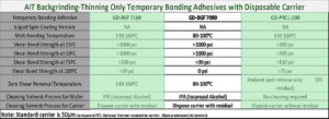 •对于GD-BGF-7090(也可在更高温度下使用GD-BGF7160),可在90℃时从成品晶圆上剥离。ºC或160º分别为C。在常温下用IPA容易清洁器件晶片的同时,将带有蜡胶的一次性载体放置。